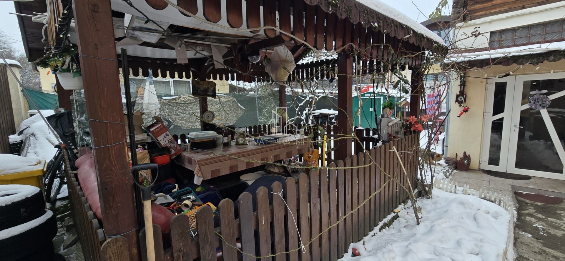 In the yard we find a gazebo, there are cars in the yard.